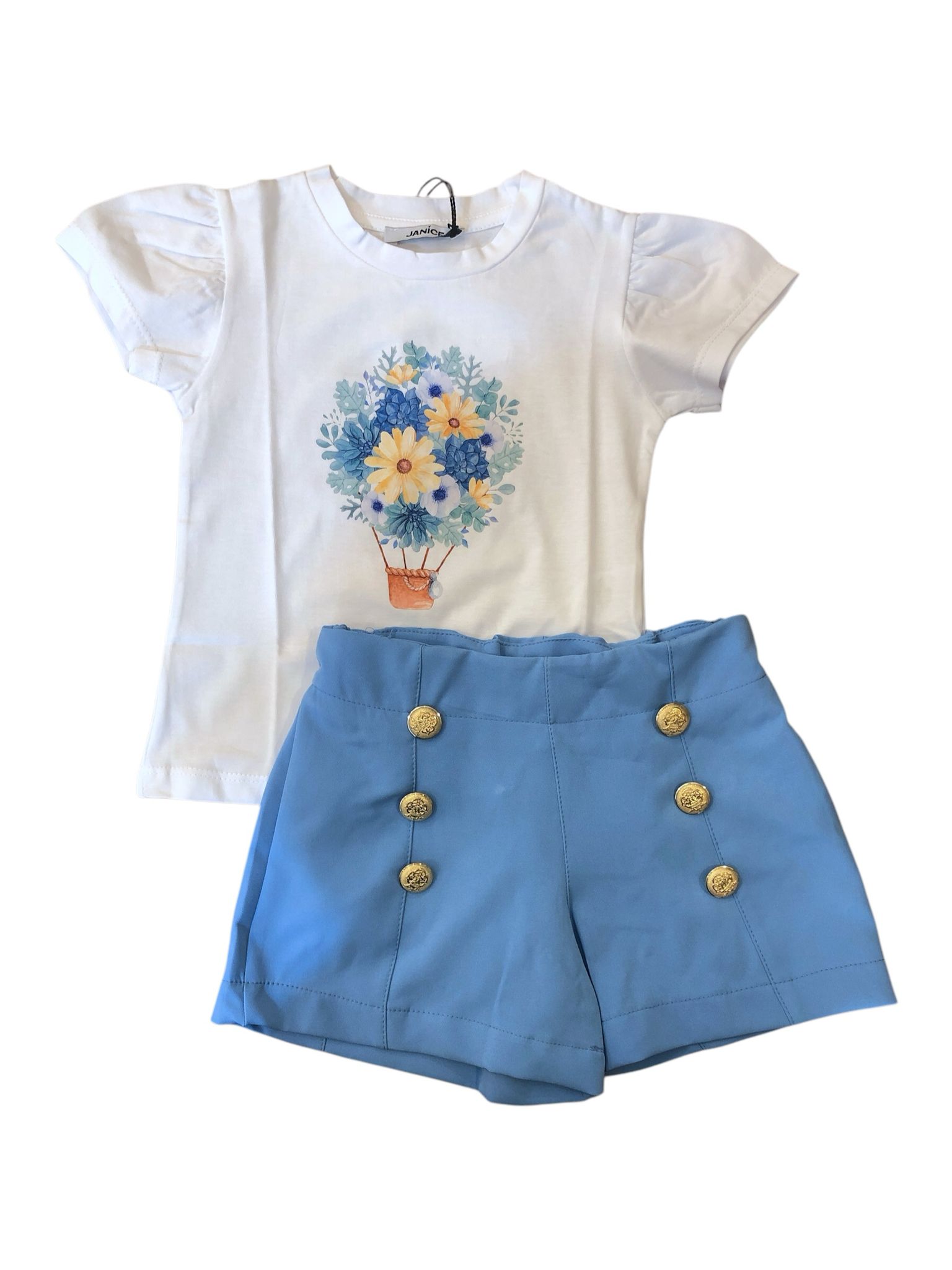 T-shirt in cotone con stampa centrale e pantaloncino con inserti oro abbinato.