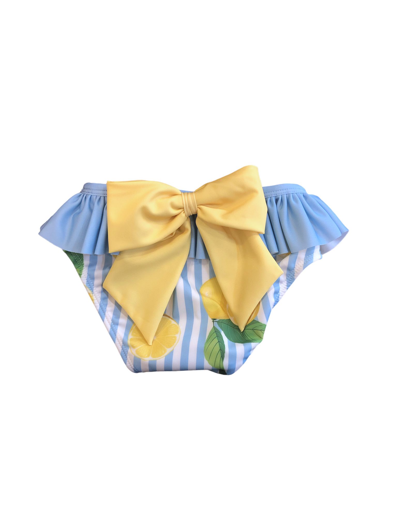 Costume a mutandina in giallo e azzurro con fantasia e fiocco sul retro.