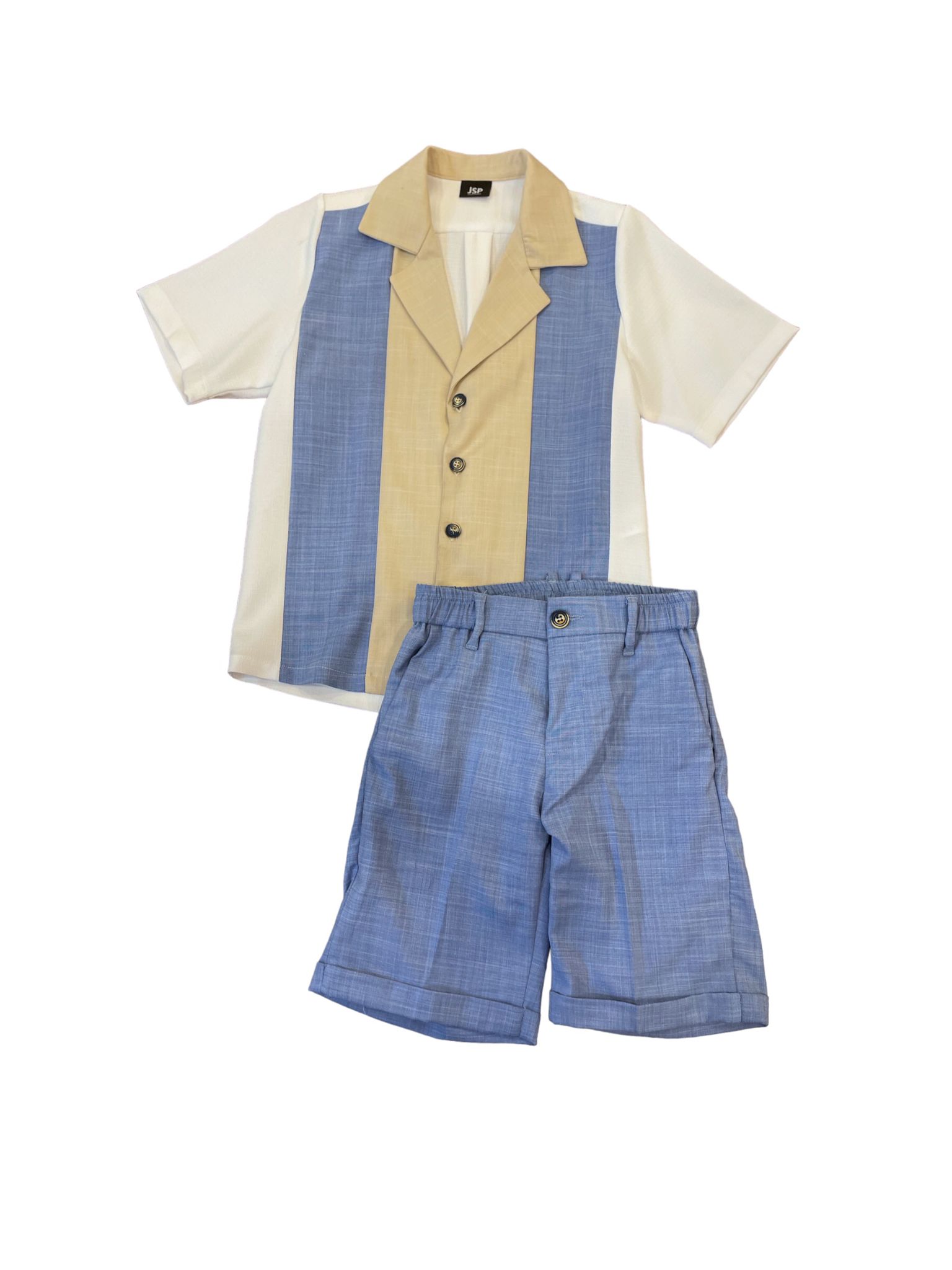 Completo effetto lino con camicia con fasce colorate e bermuda abbinato.