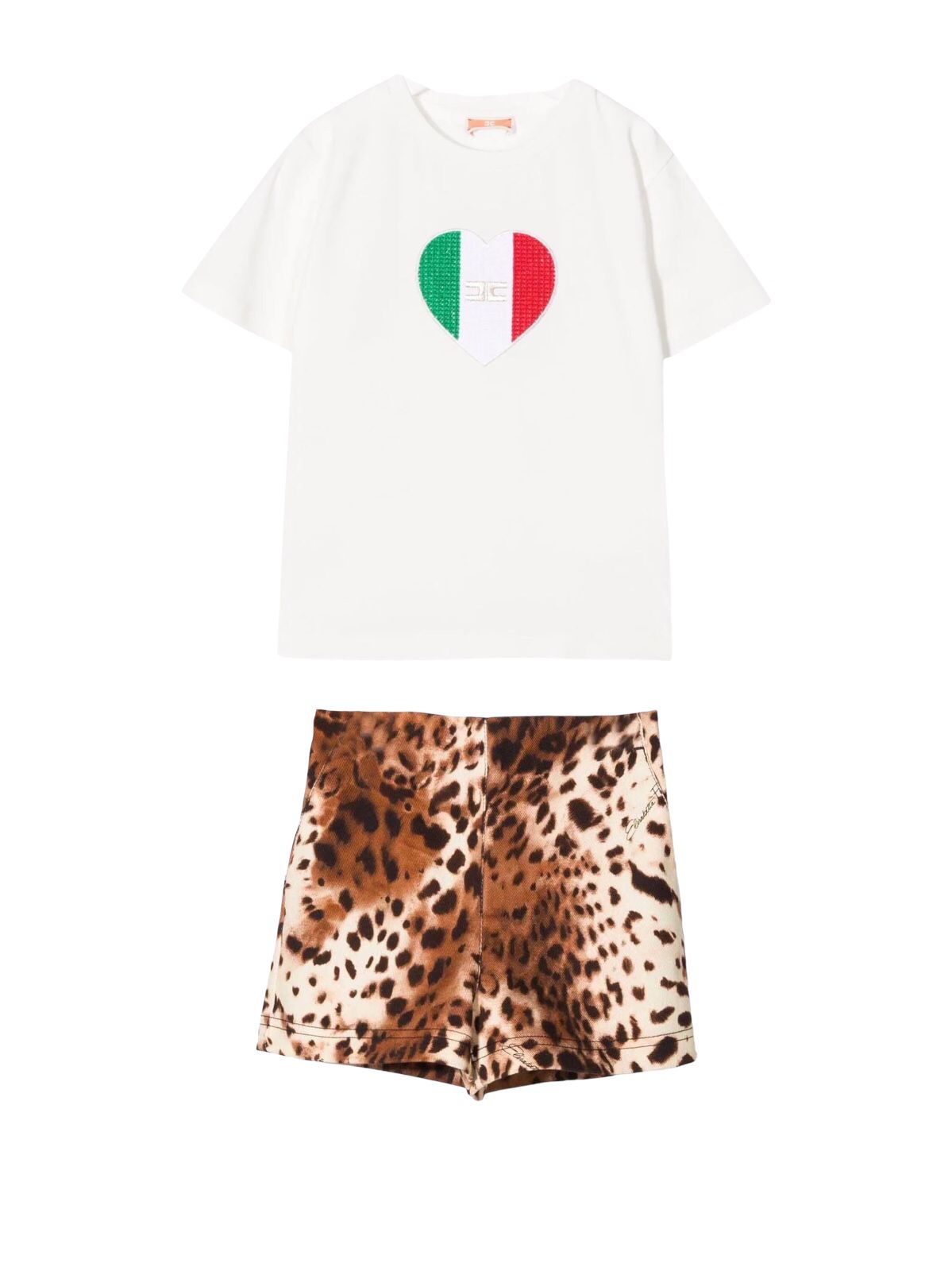 Completo con shirt bianca e stampa centrale e pantaloncino animalier.