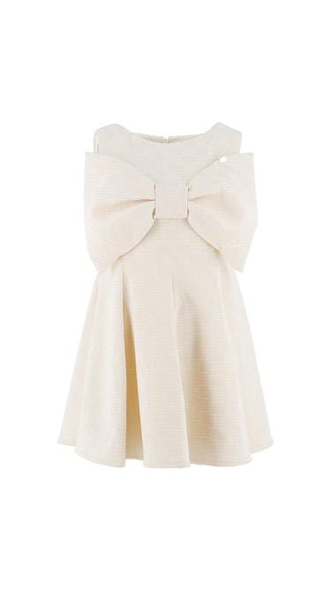 Vestito a giromanica con loghi e fiocco centrale applicato.