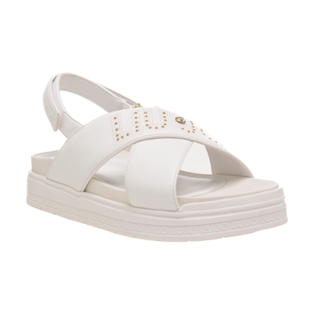 Sandali realizzati in ecopelle, fascette con strass applicati, chiusura alla caviglia con cinturino regolabile.