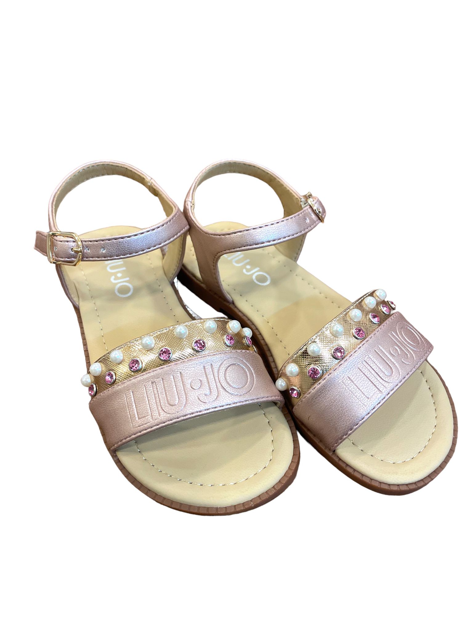 Sandali realizzati in ecopelle, fascetta con perline applicate, chiusura alla caviglia con cinturino regolabile.