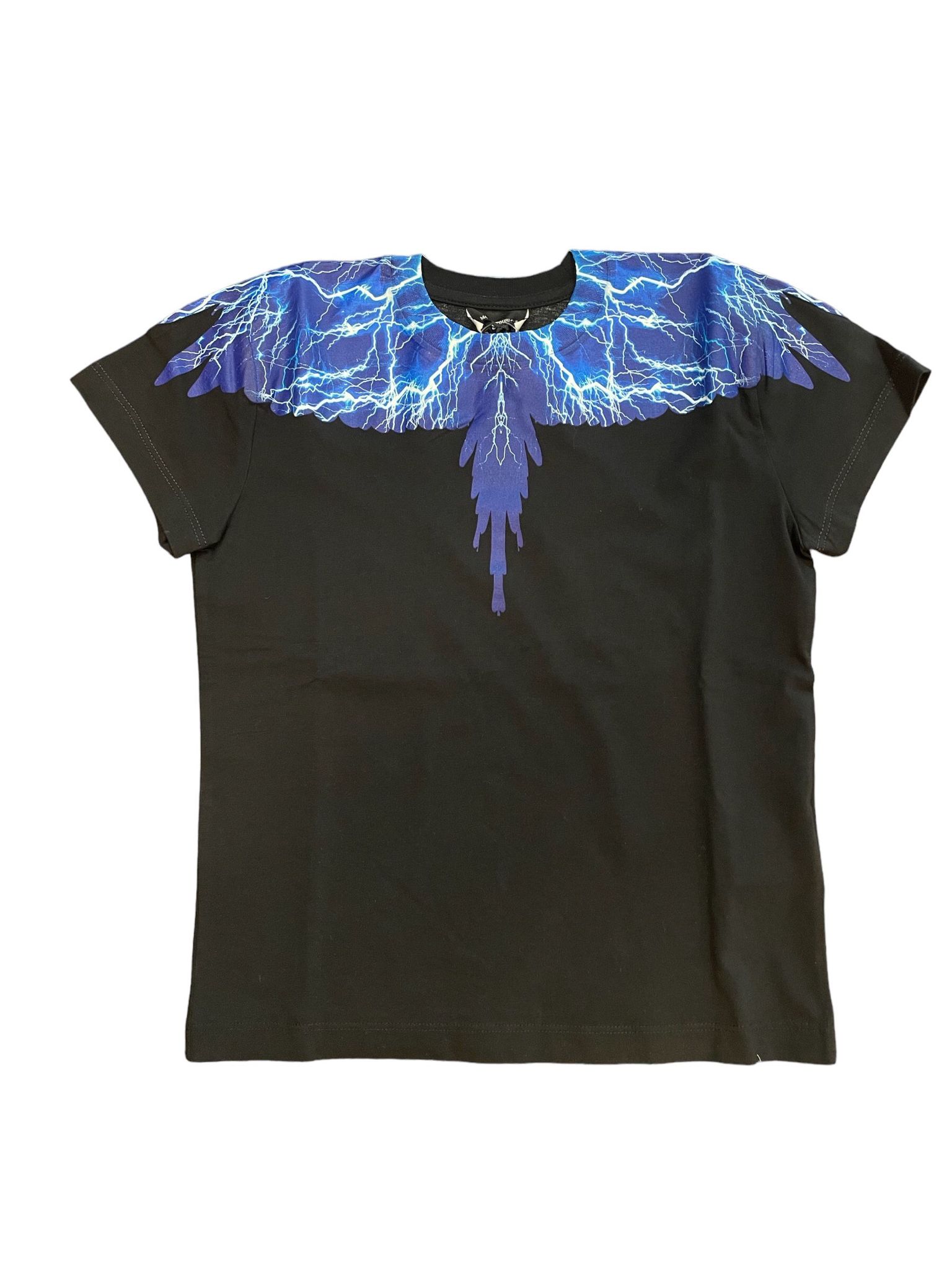 T-shirt nera con stampa blu di fulmini sulla parte superiore.