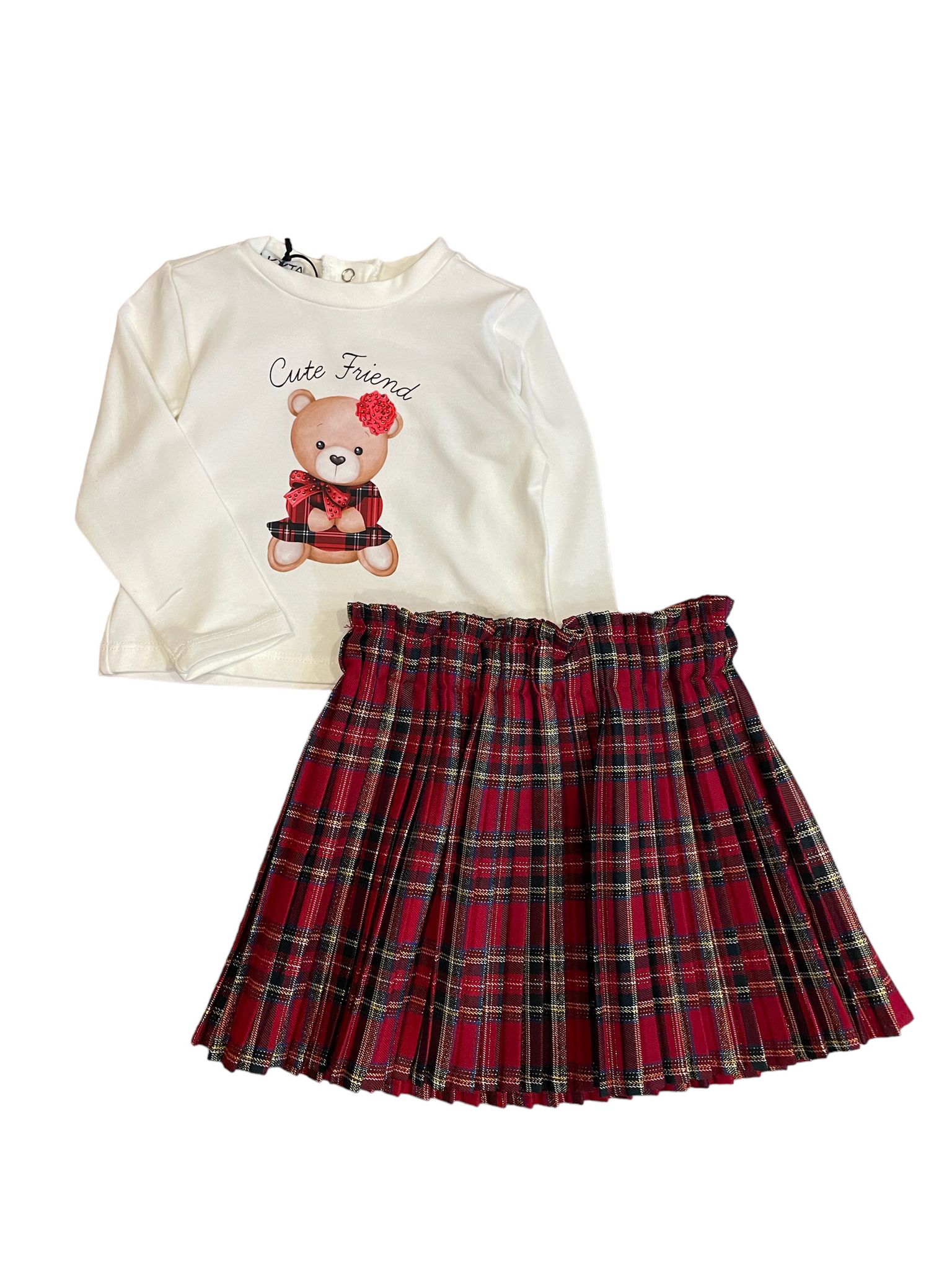 Maglia bianca con stampa e gonna tartan abbinata.