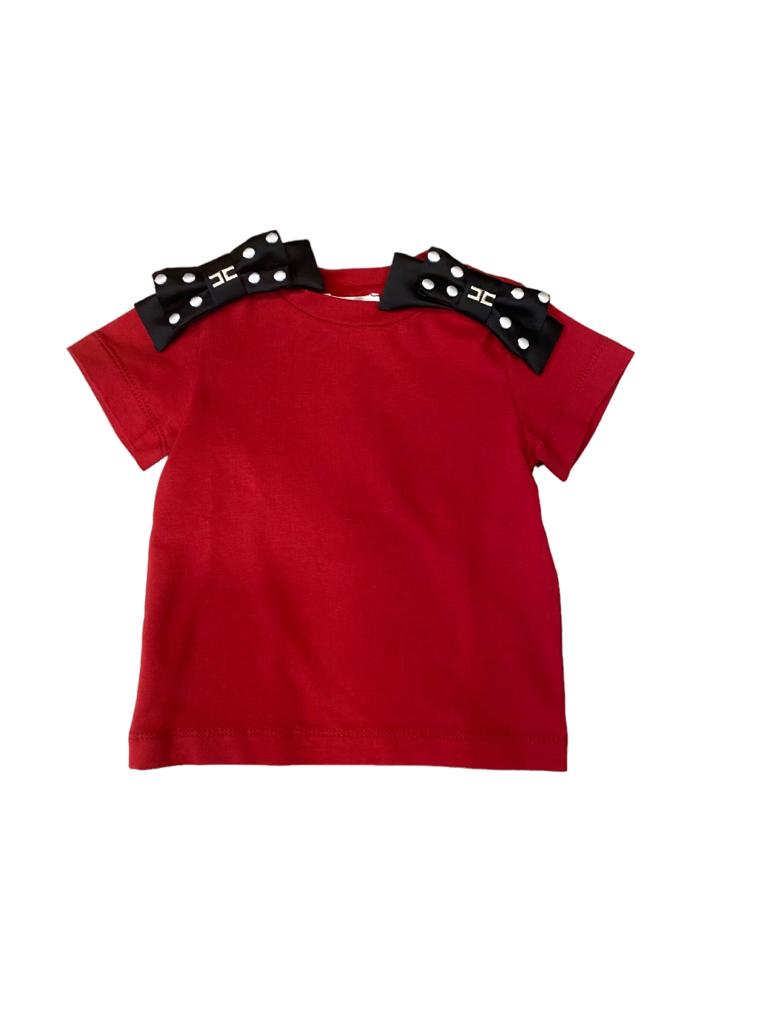 T-shirt rossa con fiocchi a pois sulle spalline.