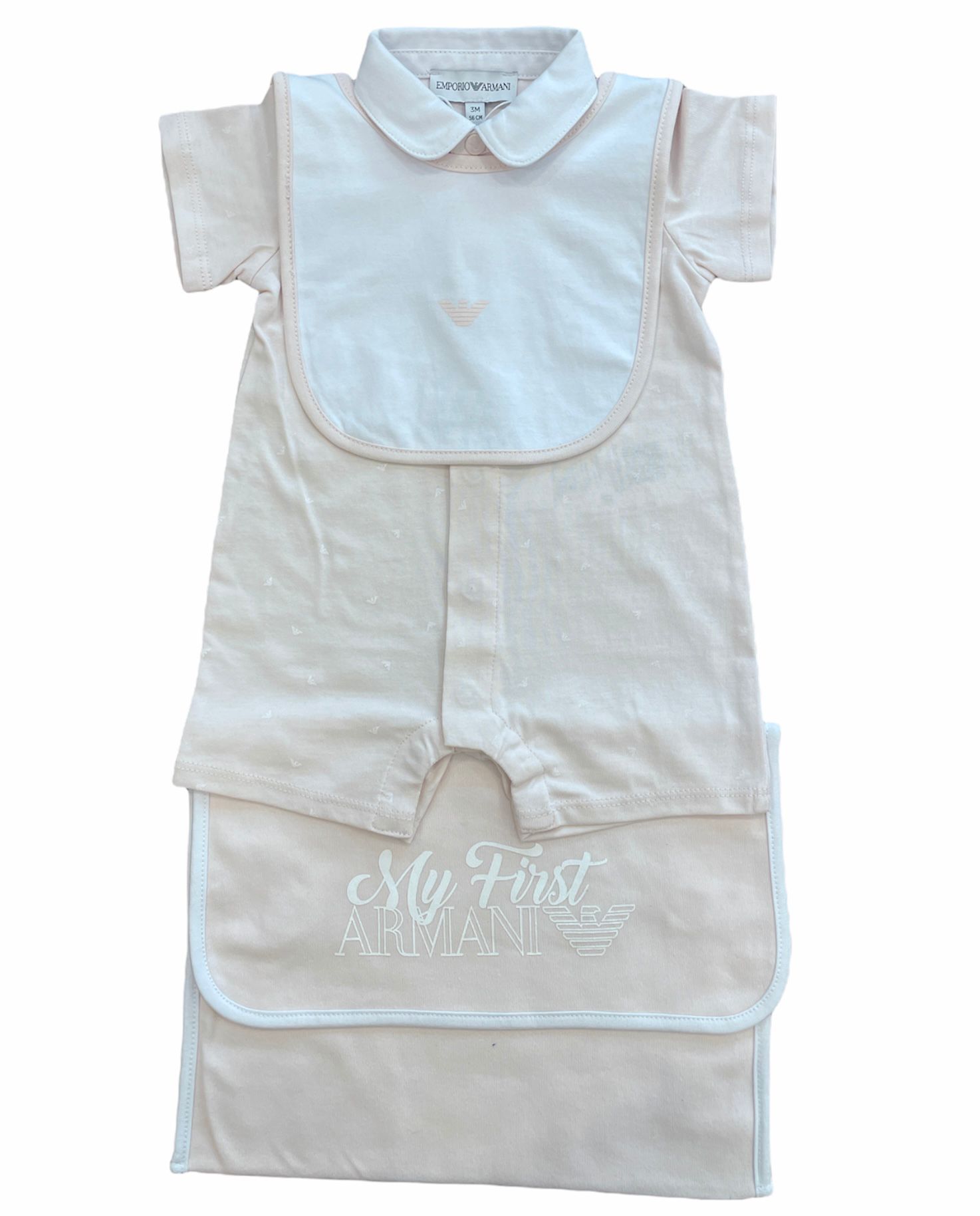 Pagliaccetto rosa con bavetta bianca e rosa abbinata; comprende la sacchetta.