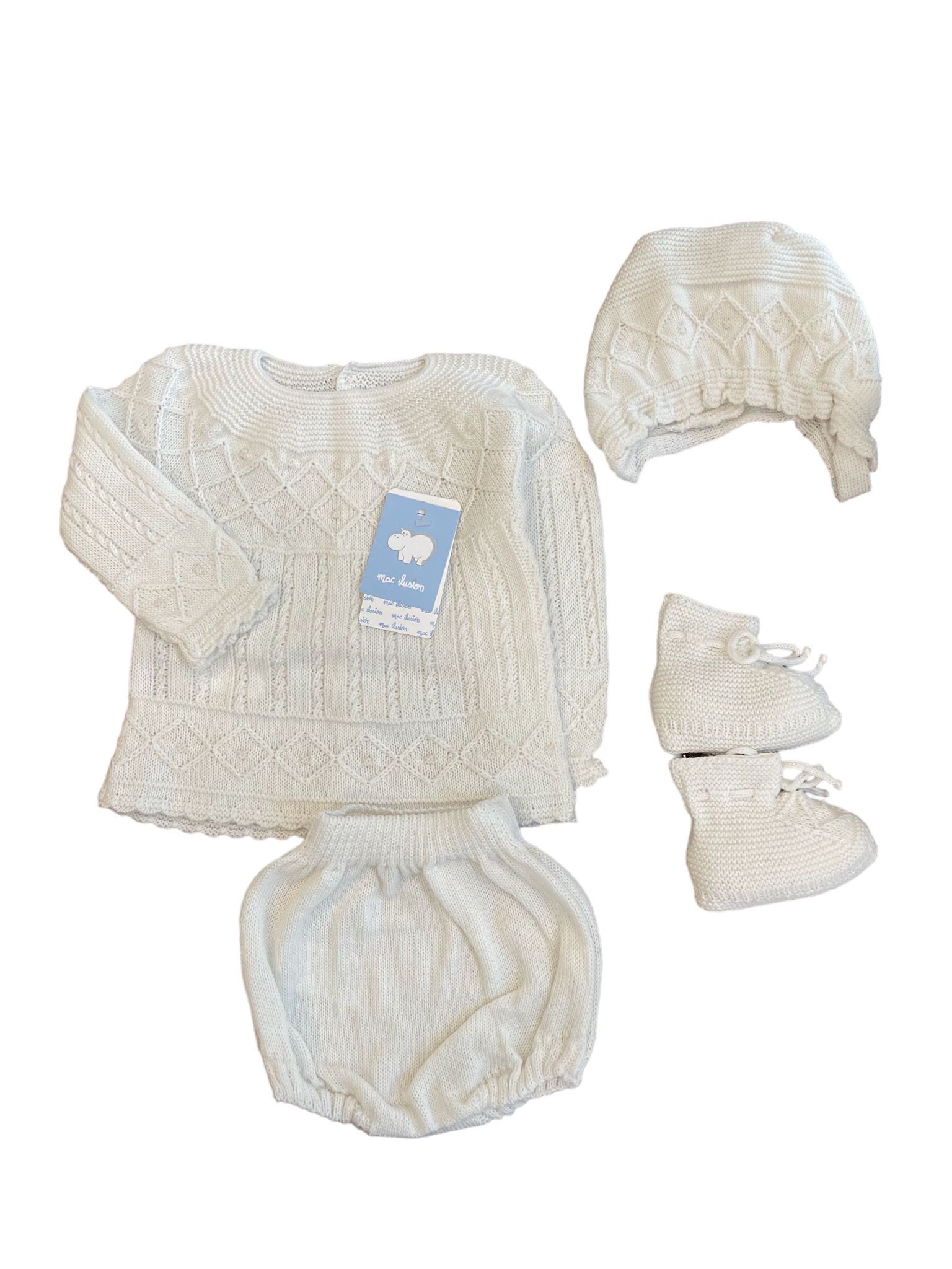 Completo in lana bianco compreso di completo con culotte, cuffietta e babbucce.