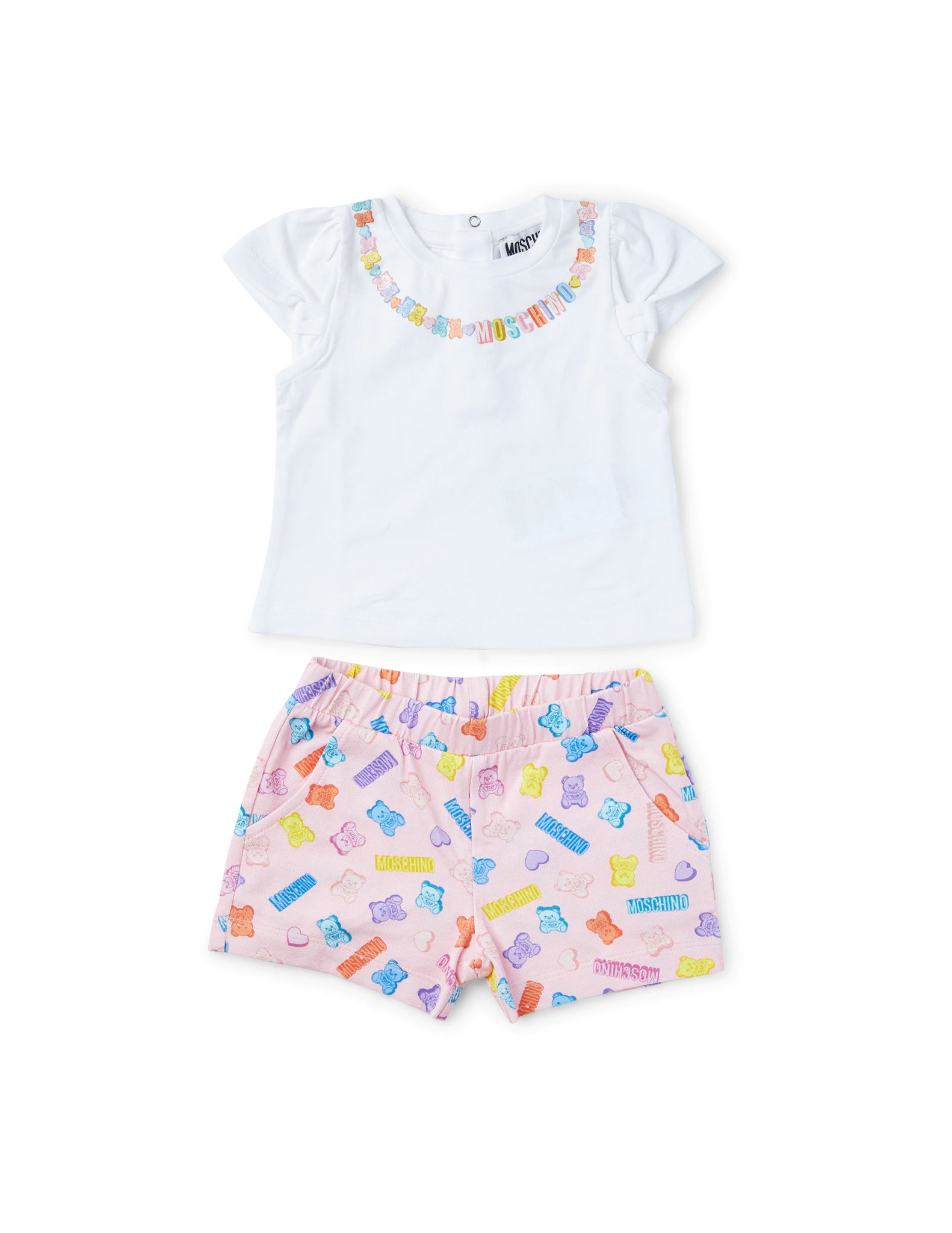 T-shirt bianca con loghi e pantaloncino rosa con loghi abbinato.