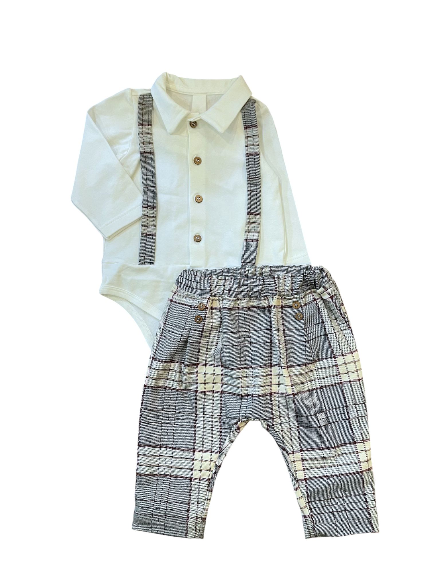 Camicia a body in caldo cotone con fantasia e apertura con bottoncini e pantalone a fantasia abbinato.