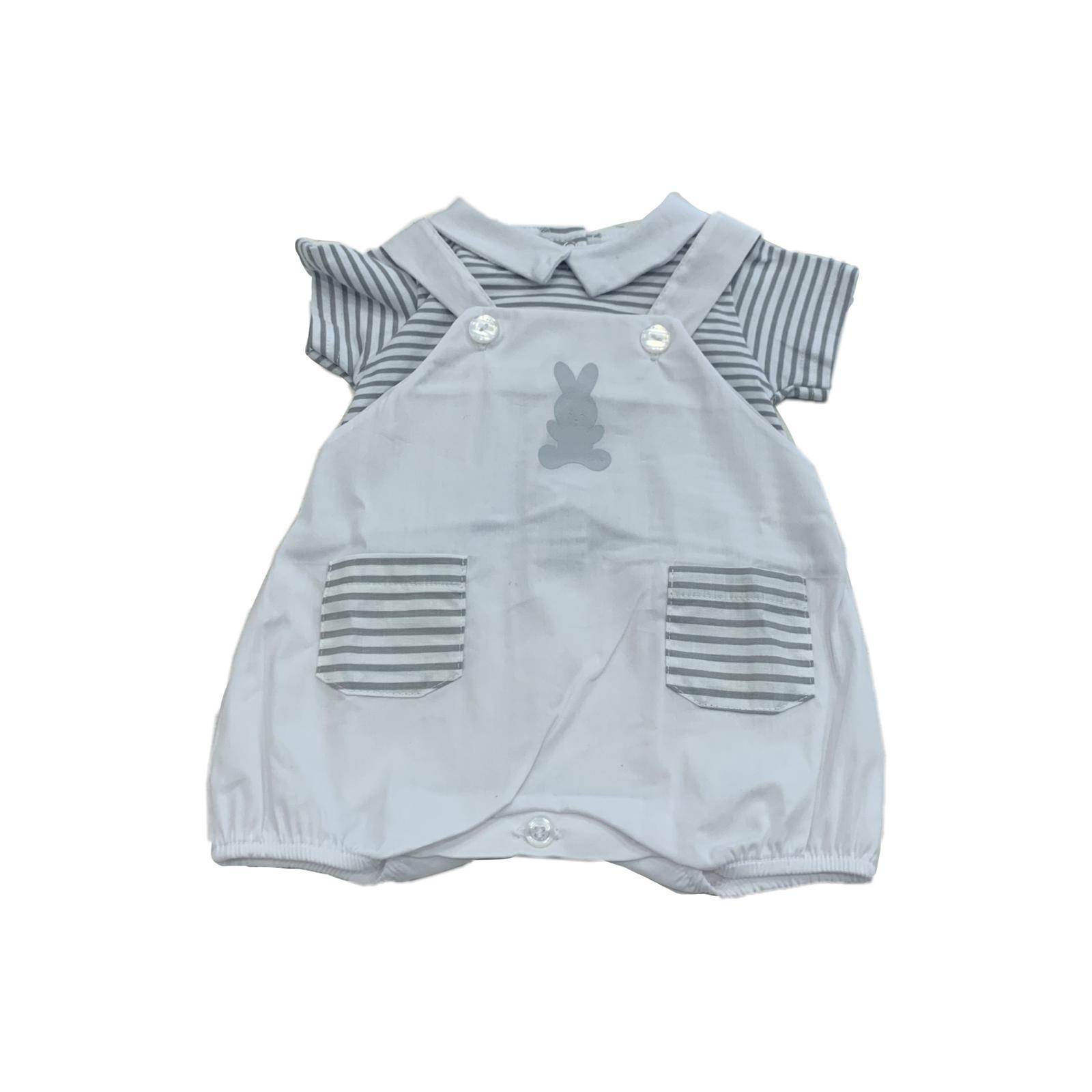 Pagliaccetto effetto salopette bianca e a righe grigie e bianche, taschini laterali.