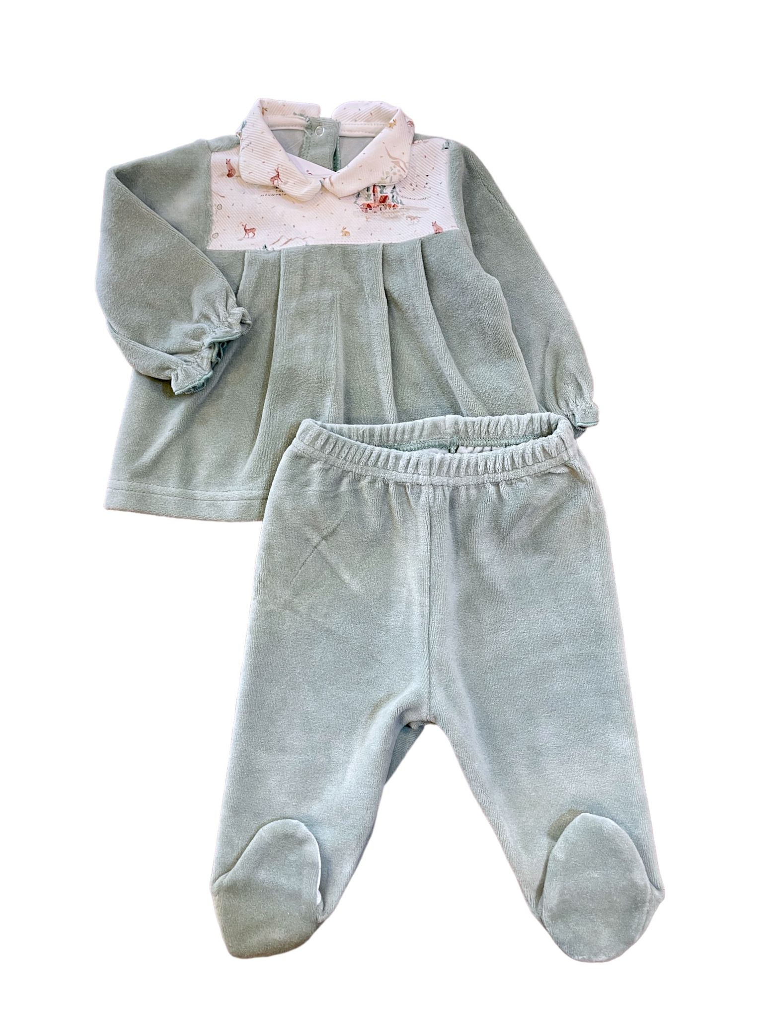 Tutina in ciniglia due pezzi a fantasia.