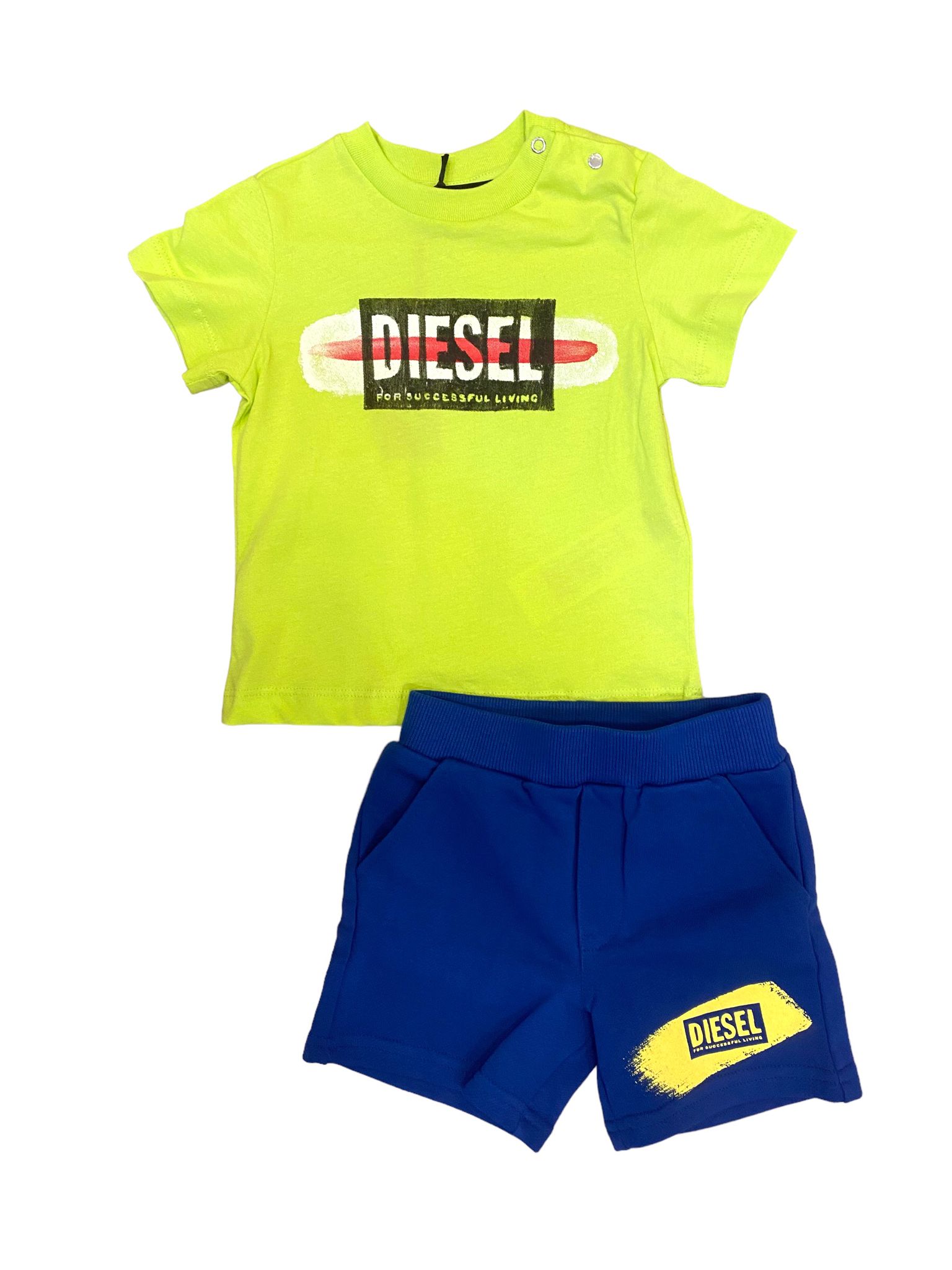 T-shirt lime con logo centrale e bermuda blu abbinato.