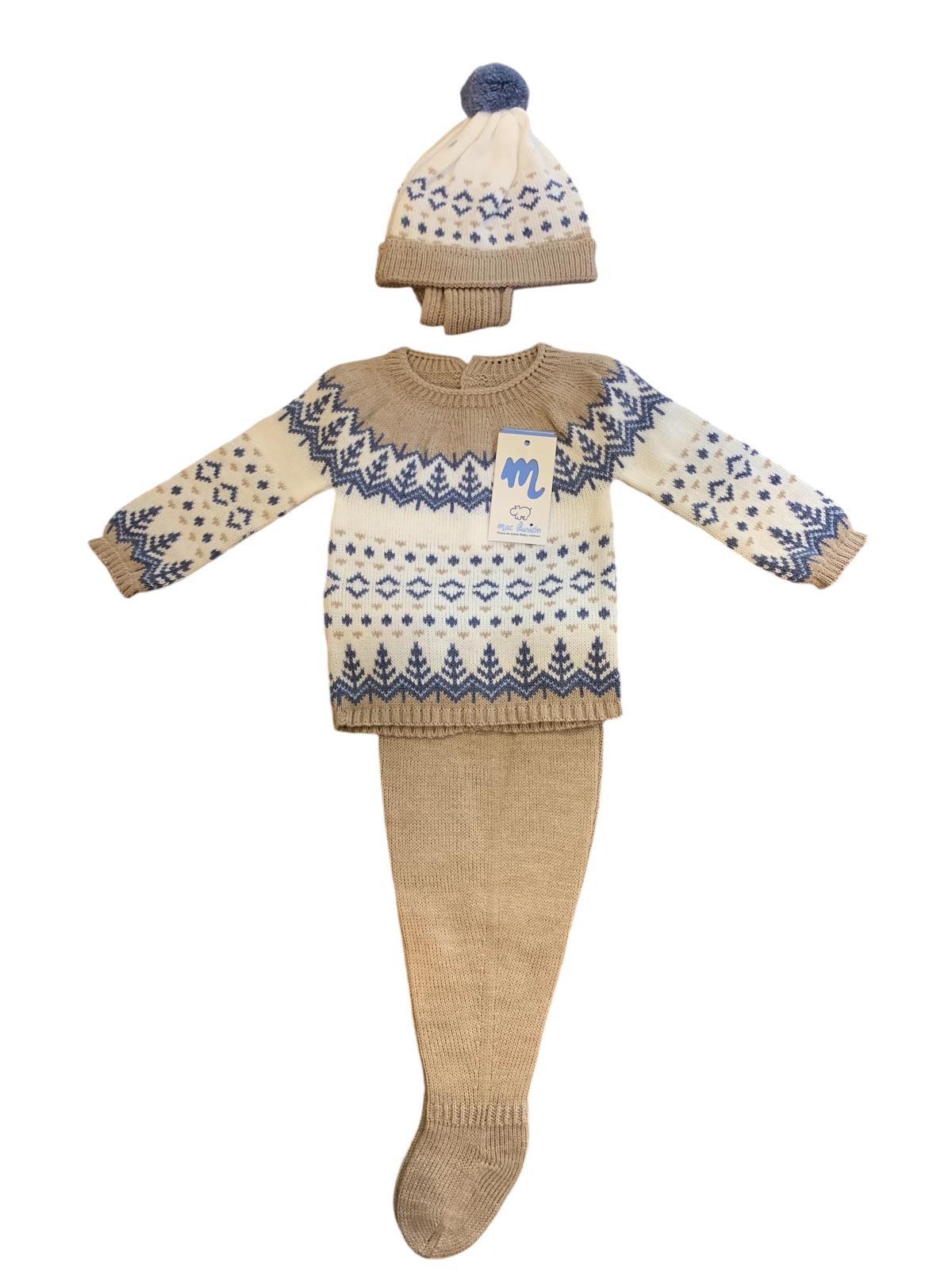 Tutina due pezzi in lana a fantasia con cappellino abbinato.