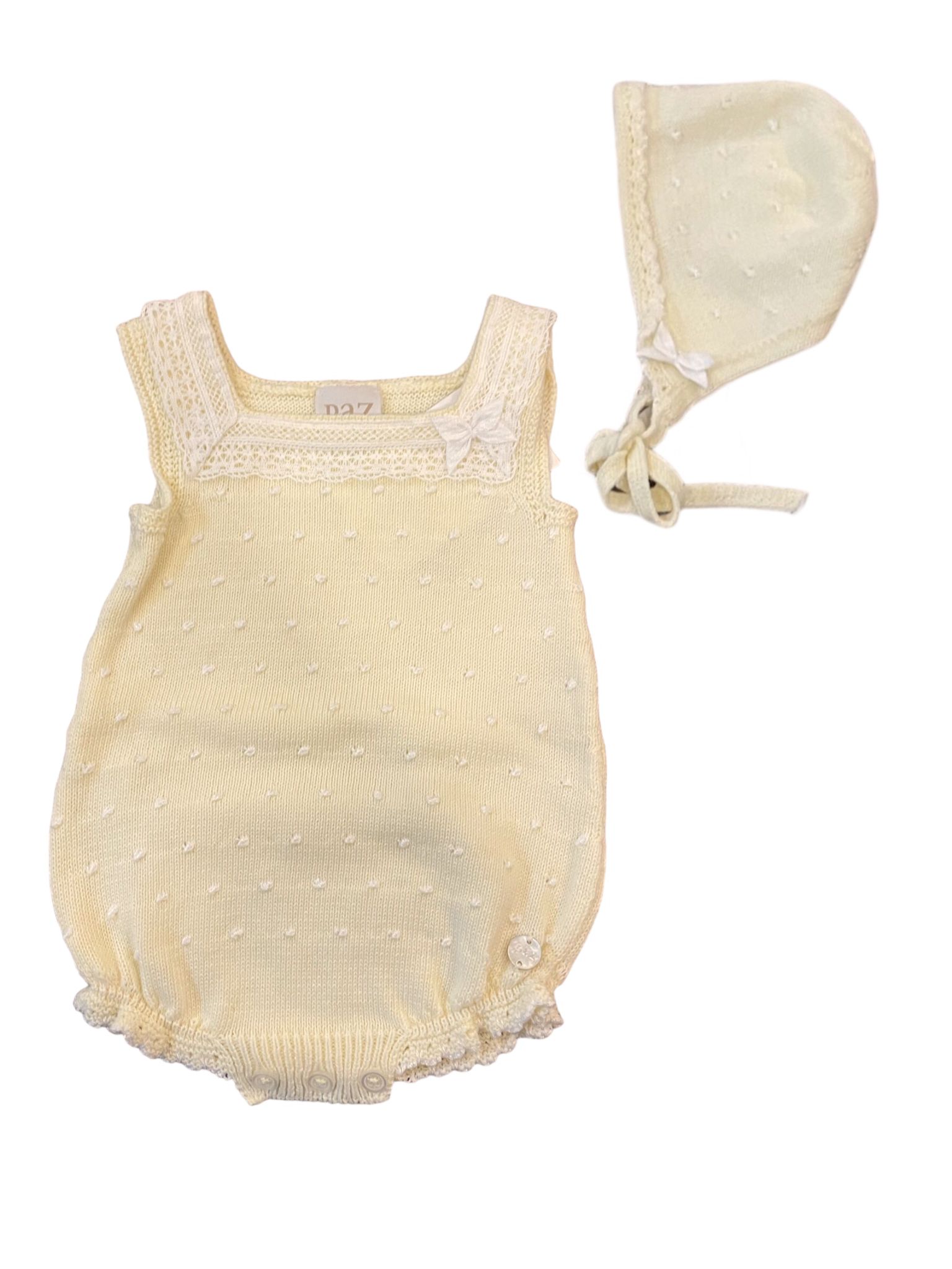 Pagliaccetto in filo con ricami con cappellino abbinato.