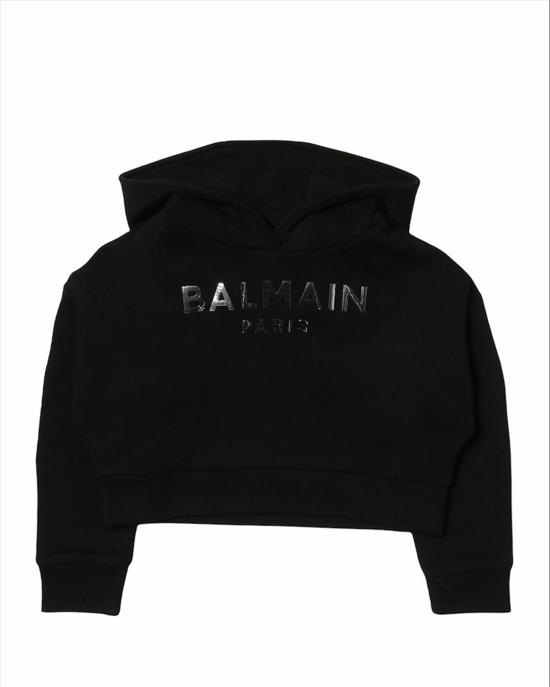 Felpa nera corta con cappuccio e logo in argento centrale.