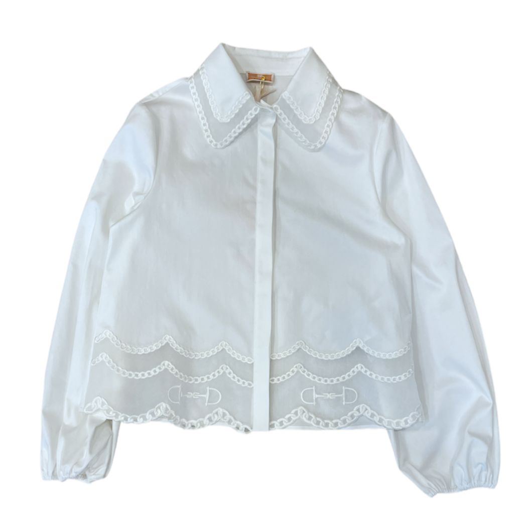 Camicia bianca con ricami su colletto, maniche e bordo.
