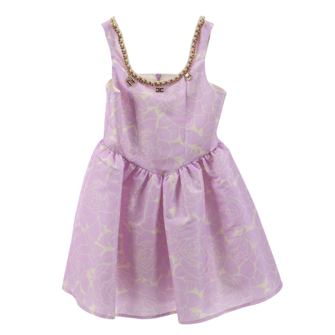 Vestito in cotone lilla e avorio con catenina al collo.